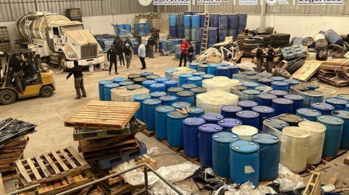Durante el operativo fueron asegurados cerca de 200 tambos con solvente, ácido clorhídrico y thinner, más de 2,000 costales con sustancia granulada, diez costales gigantes con precursor químico, 95 bidones con cloro, amoniaco y formol, 25 paquetes con marihuana, así como una pipa con alrededor de 7,000 litros de hidrocarburo de “aparente procedencia ilícita”.