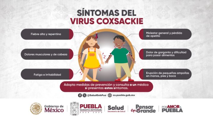 PUEBLA, Pue.– El Gobierno del Estado de Puebla, a través de la Secretaría de Salud, informa que se atendió de manera oportuna el reciente brote de casos del virus coxsackie registrado en los municipios de Izúcar de Matamoros, Puebla, Tlachichuca y Libres.