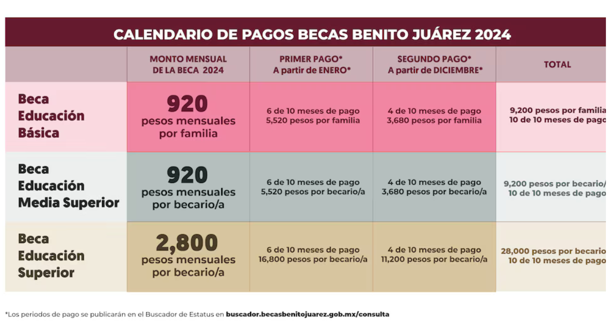 El programa otorga becas durante 10 meses del año fiscal, excluyendo julio y agosto. Las fechas de pago pueden sufrir modificaciones por causas de fuerza mayor, según la Coordinación Nacional de Becas para el Bienestar.