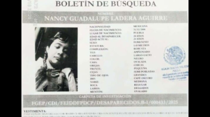 Puebla, Pue.- La Fiscalía General del Estado de Puebla ha emitido un boletín de búsqueda para localizar a Nancy Guadalupe Ladera Aguirre, de 24 años de edad, quien fue vista por última vez el 13 de marzo de 2025 en el Centro Comercial Periplaza, en la ciudad de Puebla.