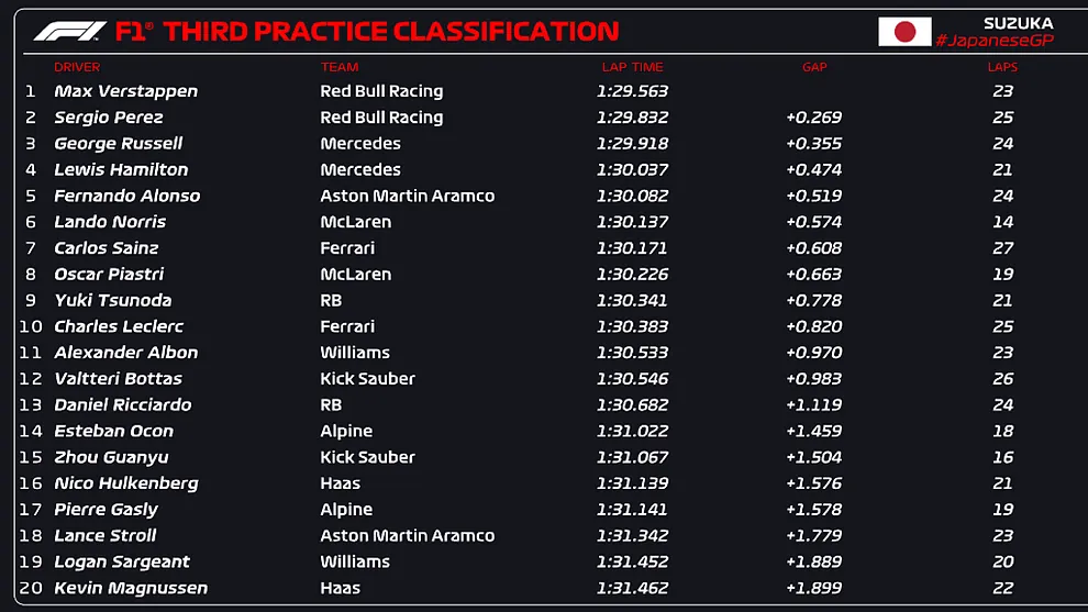 En tercer lugar quedó Landó Norris, Carlos Sainz en cuarto lugar y Fernando Alonso en quinto lugar, Lewis Hamilton quedó en el lugar séptimo.