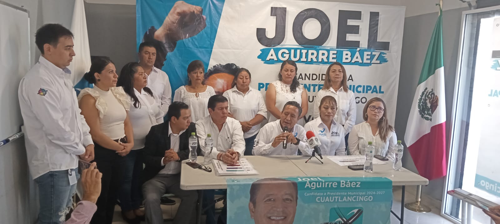 El candidato a la presidencia municipal de Cuautlancingo por Nueva Alianza, Joel Aguirre Báez, presentó este miércoles su cierre de campaña junto a su planilla, frente a medios de comunicación, Joel Aguirre enfatizó que trabajará de la mano con los ciudadanos para que el municipio obtenga el cambio que merece.