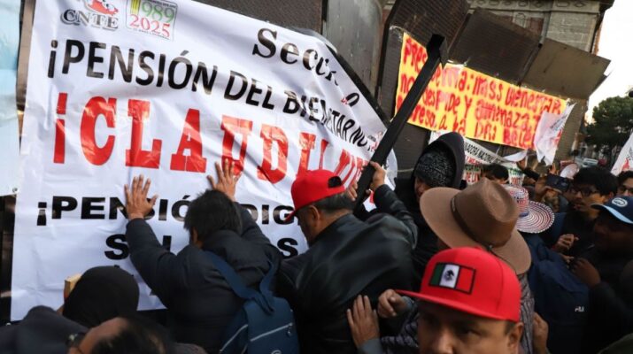 Maestros de la Coordinadora Nacional de Trabajadores de la Educación (CNTE) intentaron este jueves derribar las vallas que rodean el Palacio Nacional, desde donde habitualmente la presidenta Claudia Sheinbaum ofrece sus conferencias de prensa matutinas y que es, además, su residencia.
