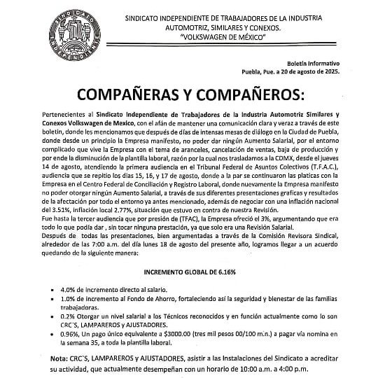 El Sindicato Independiente de Trabajadores de la Industria Automotriz, Similares y Conexos Volkswagen de México informó este 20 de agosto que sobre las negociaciones con la empresa alemana, en las que se alcanzó un acuerdo que establece un incremento salarial global del 6.16% para los trabajadores.
